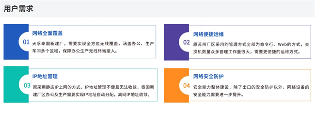 为积极推动工业生产及办公的灵活性升级,天孚通信对泰国生产基地的网络建设提出了如下需求: